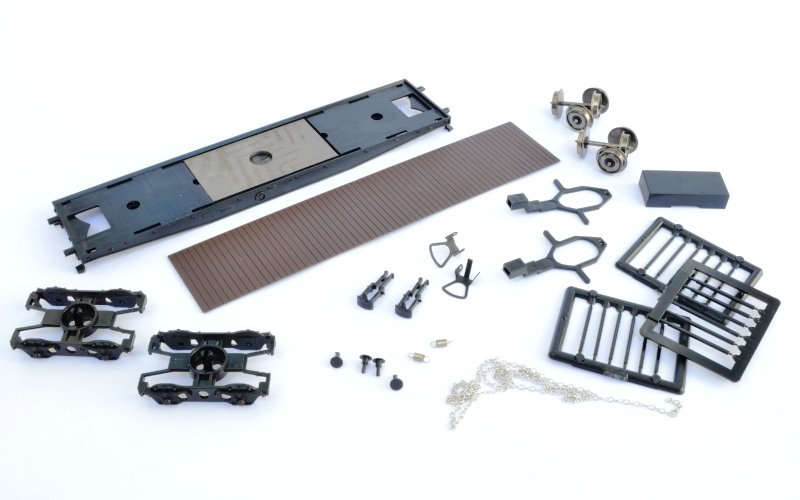 | Stavebnice plošinového vozu Pao s klanicemi (až 9 sad klanic), bez obtisku, kompletní sada dílů vč. dvojkolí, podvozky 26 2.8 - původní forma. Podvozky jsou ideální pro modely, které jsou staticky vystavené. V případě dotazů nám napište na mail info@bramos.eu. | |